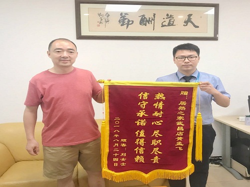 近期,武昌店業(yè)務(wù)部黃孟飛在客訴處理的過(guò)程中,熱情耐心,盡職盡責(zé),圓滿的解決了顧客劉女士的訴求。劉女士的老公特贈(zèng)送了一面錦旗,用以表示對(duì)黃孟飛的感謝和對(duì)居然之家售后服務(wù)的認(rèn)可。